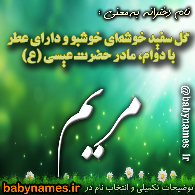 معنی: (تلفظ: maryam) (در گیاهی) گل سفید خوشه ای خوشبو و دارای عطر با دوام، و نیز گیاهی علفی، پایا و زینتیِ این گل که از خانواده ی سوسن است و پیاز دارد، نام سوره ی نوزدهم از قرآن کریم دارای نود و هشت آیه، (در اعلام) مریم عذرا مادر عیسی (ع) دختر عِمران و از نسل داوود – گلی سفید و خوشبو و دارای عطر بادوام، نام مادر عیسی (ع )، نام سوره ای در قرآن کریم، تالع ان با نام سجاد رقم خورده و با ان کامل میشود