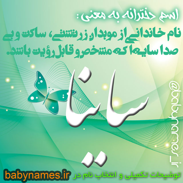 معنی: (تلفظ: sāynā) (اوستایی) نام خاندانی از موبدان زرتشتی، (در طبری) ساکت و بی صدا، سایه ای که مشخص و قابل رؤیت باشد – سیمرغ، عنقا