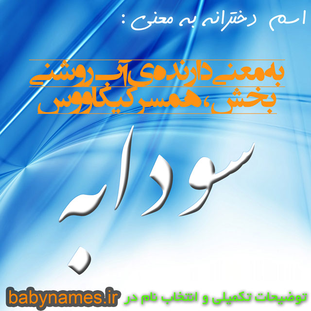 سودابه : (= سوداوه) 1- (در پهلوی) به معنی دارنده ی آب روشنی بخش؛ 2- (اَعلام) (در شاهنامه) همسر کیکاووس که چون سیاوش عشق او را نپذیرفت، بر او بهتان زد و موجب آوارگی و کشته شدن وی شد. در نتیجه به کین خواهی سیاوش، به دست رستم کشته شد.