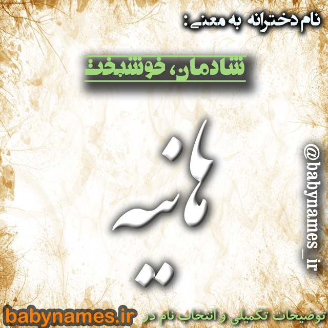 معنی: (تلفظ: hāniye) (عربی) شادمان، خوشبخت – هانیه کنیه حضرت فاطمه (س) به معنی :کسی که تمامی وسایل آرامش و آسایش شوهر خود را فراهم میکند