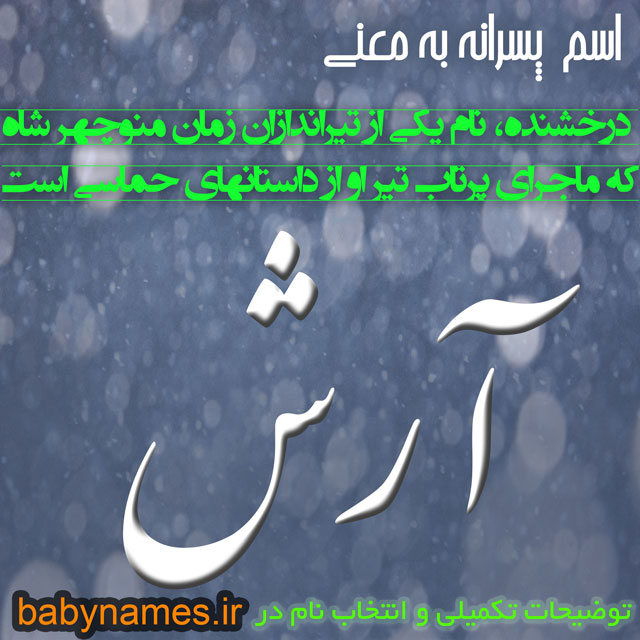 آرش : (اوستایی) 1- درخشنده؛ 2- (اَعلام) 1) نام يكي از تيراندازان زمان منوچهر شاه كه ماجراي پرتاب تير او از داستانهاي حماسي است؛ 2) نام پسر دوم كيقباد و برادر كيكاووس، مشهور به كيآرش؛ 3) (در شاهنامه) جد اعلاي اشكانيان (= ارشك و اشك).