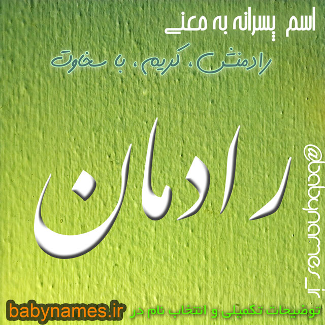رادمان : 1- رادمنش، كريم، با سخاوت؛ + ر رادمن؛ 2- (اَعلام) نام سرداري معاصر خسرو پرويز ساساني.