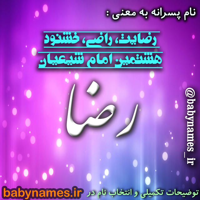 رضا : (عربي) 1- رضايت، راضي، خشنود؛ 2- (در تصوف) رضا اين است كه بنده از مشيّت حق گله نكند و نامرادي را رضاي حق بداند و با روي خوش بپذيرد. 3- (اَعلام) 1) امام رضا(ع): (= علي ابن موسي الرضا)، ابوالحسن علی ابن موسی [151-203 قمری] هشتمين امام شيعيان، که مأمون زیر فشار ایرانیان او را ولیعهد خود کرد، سپس مسموم و به شهادت رساند. آرامگاهش در مشهد بزرگترین زیارتگاه ایران است. امام غریب، شاه خراسان و ضامن آهو از لقبهای اوست؛ 2) رضا عباسی: [زنده در 1000 قمری] نقاش ایرانی، از مردم کاشان. در دربار شاه عباس کبیر فعالیت داشت؛ 3) رضا قلی خان للـه باشی، ر هدایت 3- 1)